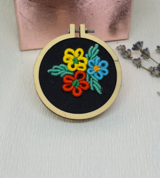 Broderia este lucrată cu fire premium, care își păstrează intensitatea culorilor. Lemnul natur, slefuit fin, oferă soliditate și o notă tactilă plăcută. Fiecare broșă este cusută individual, fiecare detaliu reflectă pasiune și migală.