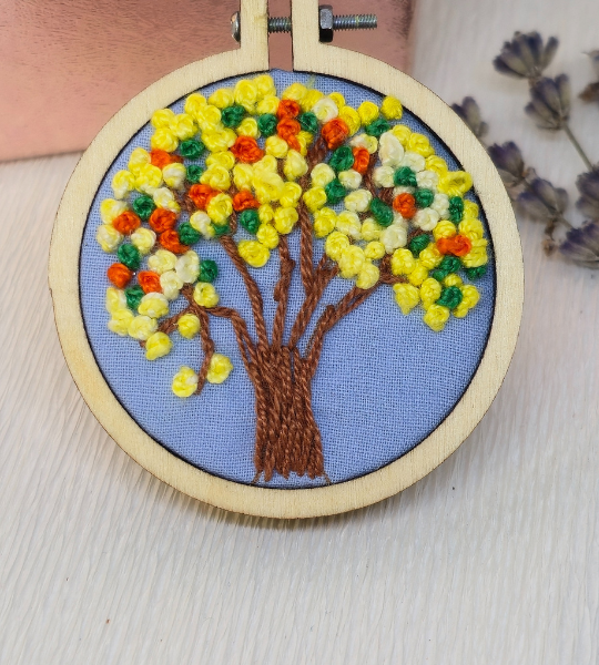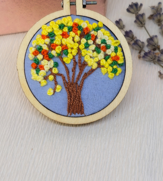 Broșa este cusută manual cu fire colorate rezistente, ce nu se decolorează ușor. Lemnul natur folosit pentru gherghef oferă durabilitate și o notă caldă, organică. Broderia redă un copac plin de culoare, cu coroana bogată, plină de viață și simboluri ale naturii. Fiecare broșă este lucrată individual, ceea ce înseamnă că nicio piesă nu este identică cu alta.
