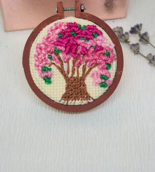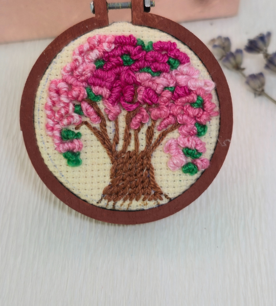 Broșă handmade „Copacul de Cireș” – broderie manuală pe pânză, mini-gherghef din lemn natur (⌀ 5,5 cm). Evocă frumusețea efemeră a florilor și feminitate delicată.