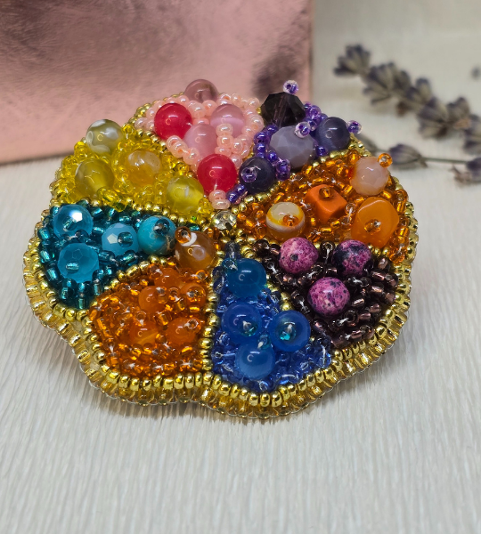 Broșă handmade – Rainbow Bloom Brooch, realizată manual cu mărgele de sticlă și ac din inox hipoalergenic, potrivită pentru orice ținută.