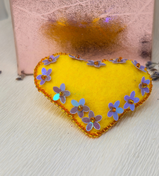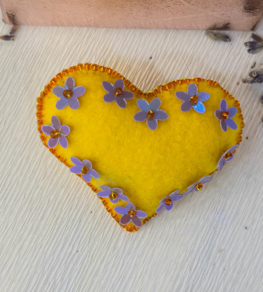 „Broșă mărțișor „Inimă cu lila”, lucrată manual din fetrul galben, decorată cu mărgele Toho și paiete. Un accesoriu vesel, plin de soare și Energie.”