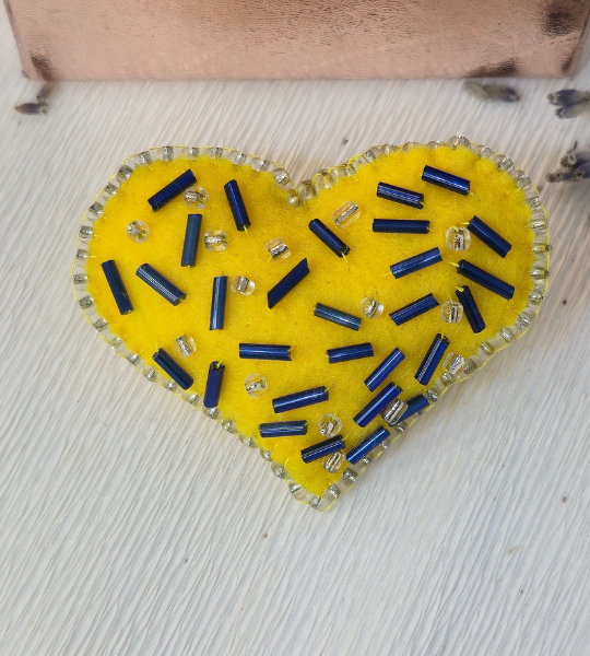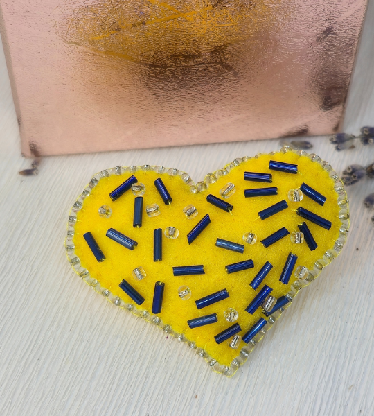 „Broșă mărțișor „Inimă cu mărgele ”, lucrată manual din fetrul galben, decorată cu mărgele Toho și paiete. Un accesoriu vesel, plin de soare și Energie.”