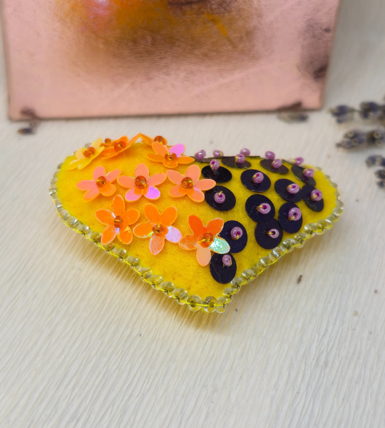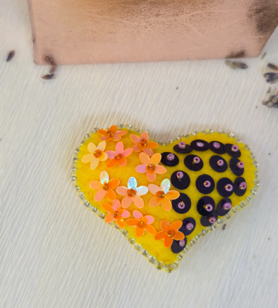 „Broșă mărțișor „Inimă cu petale”, lucrată manual din fetrul galben, decorată cu mărgele Toho și paiete. Un accesoriu vesel, plin de soare și Energie.”