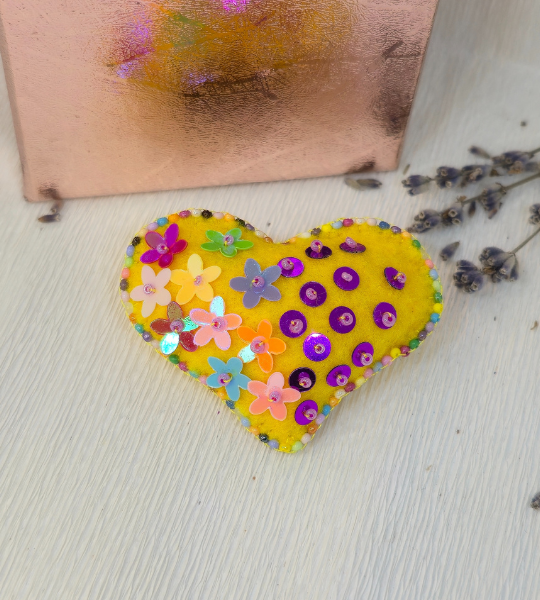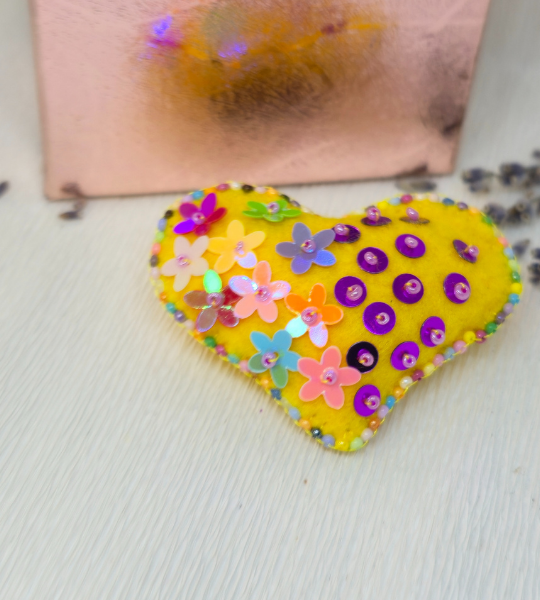 „Broșă mărțișor „Inimă multicoloră”, lucrată manual din fetrul galben, decorată cu mărgele Toho și paiete. Un accesoriu vesel, plin de soare și Energie.”