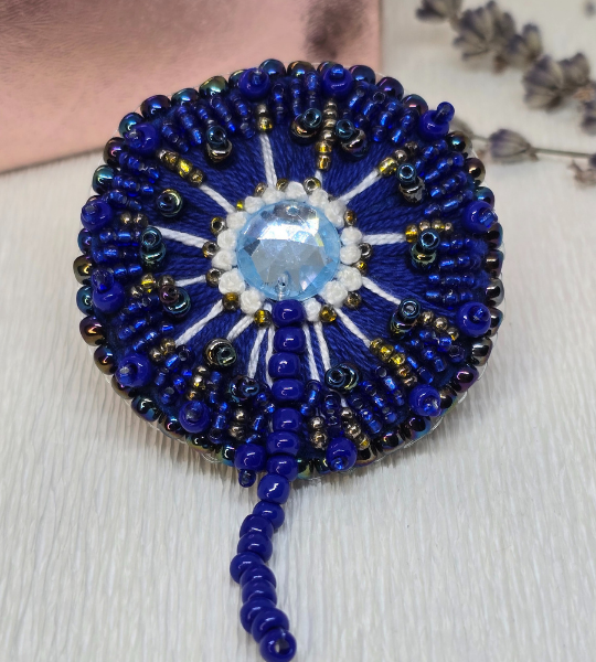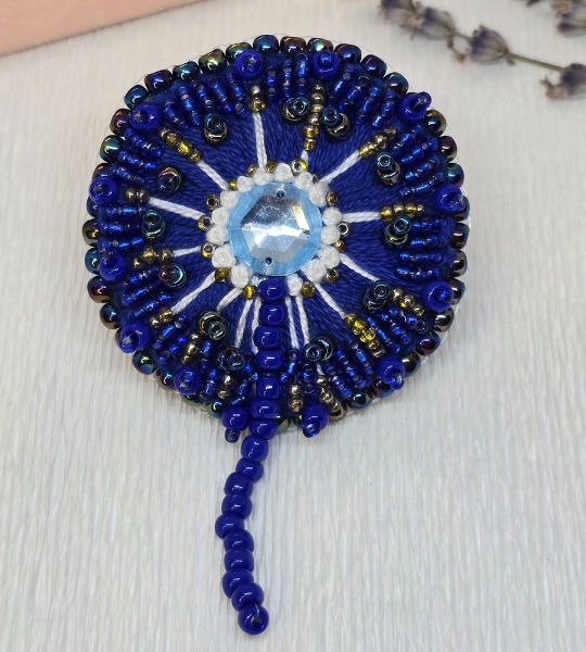 Broșă păpădie cobalt handmade, realizată manual cu mărgele de sticlă și ac din inox hipoalergenic, potrivită pentru orice ținută.