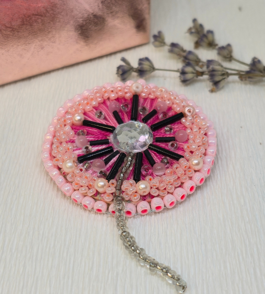 Broșă păpădie corai handmade, realizată manual cu mărgele de sticlă și ac din inox hipoalergenic, potrivită pentru orice ținută.