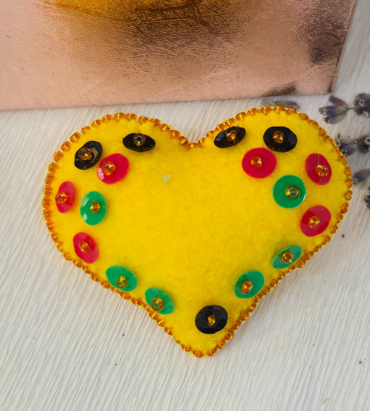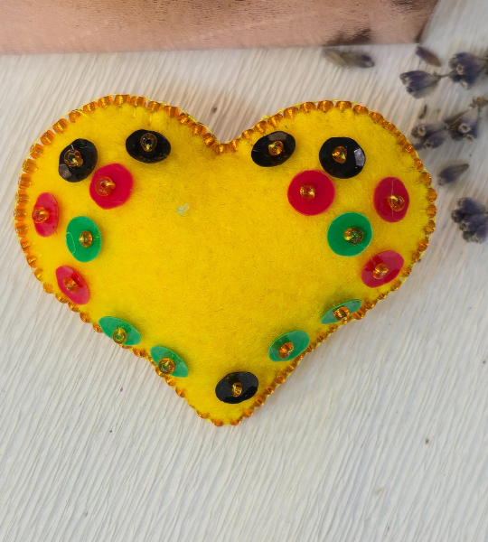 „Broșă mărțișor „Inimă cu buline”, lucrată manual din fetrul galben, decorată cu mărgele Toho și paiete. Un accesoriu vesel, plin de soare și Energie.”