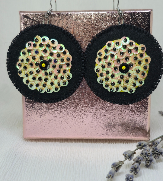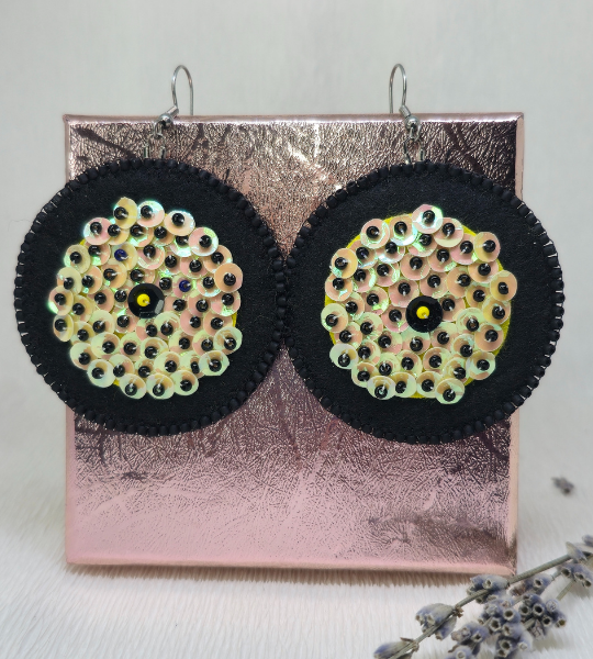 Acești Cercei handmade – Statement Rotunzi „Golden Eclipse” sunt o bijuterie unică, realizată manual cu atenție la fiecare detaliu.