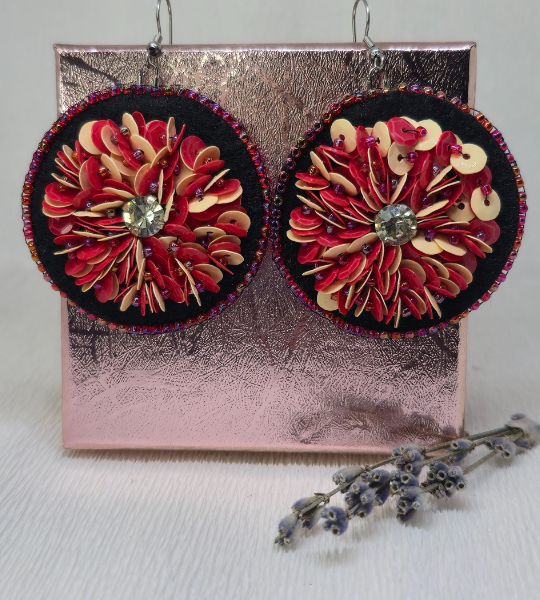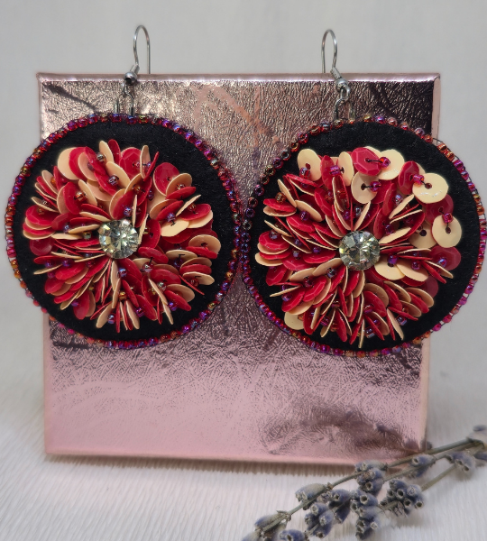 Cercei Statement rotunzi, handmade, cu model floral tridimensional din paiete roșii și crem, piatră centrală strălucitoare.