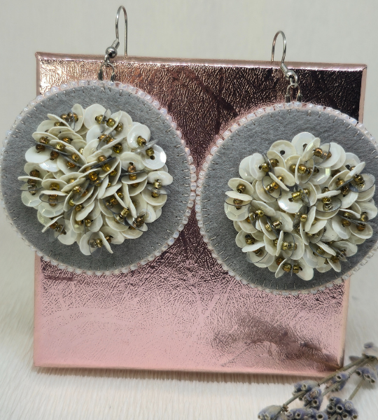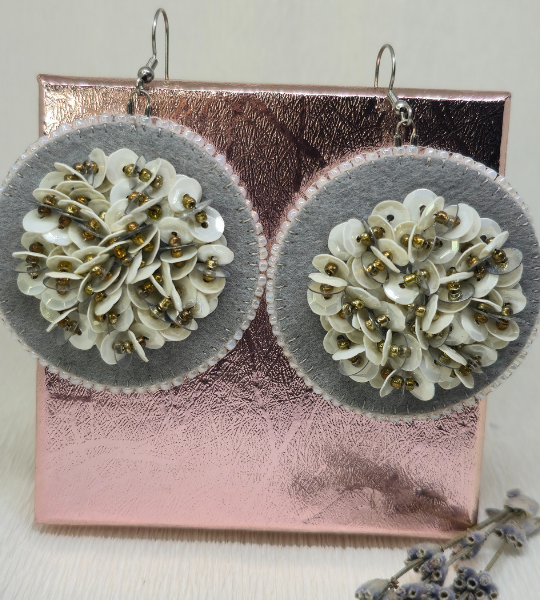 Cercei Statement rotunzi „Grey Sophistication”, handmade, cu mărgele gri aplicate manual pe bază textilă, design elegant și rafinat.