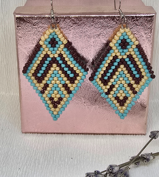 Cercei Toho handmade „Ethno Vibes”, din mărgele crem, maro și turcoaz. Accesorii statement, cu design geometric și inspirație etnică modernă.