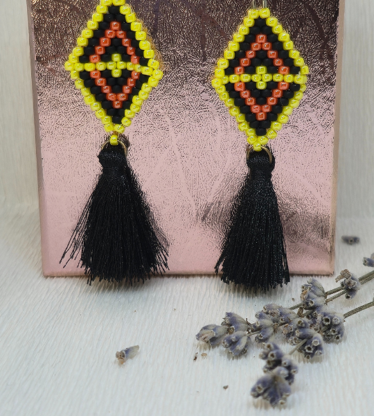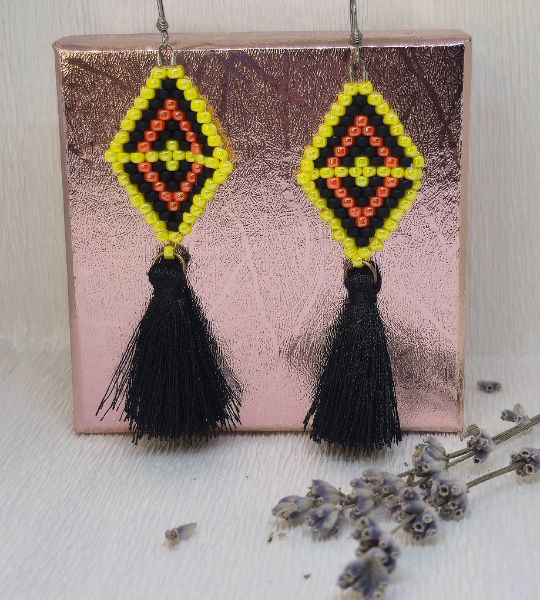 Cercei Toho handmade „Festival Spirit”, cu ciucuri negri și model geometric colorat. Bijuterii statement, moderne și pline de energie.