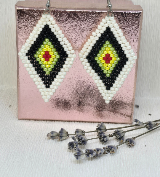 Acești cercei îmbină albul delicat și negrul intens cu accente de verde luminos și roșu aprins.