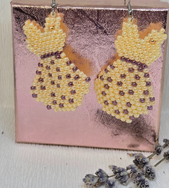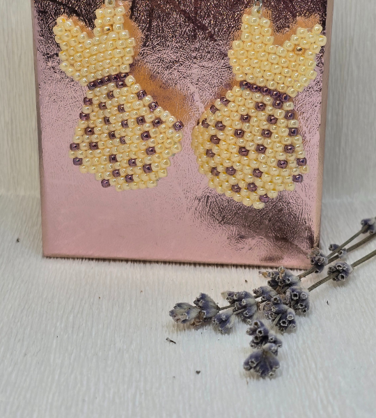 Cercei Toho handmade „Elegant Dress”, în formă de rochie, din mărgele crem și mov. Accesorii unicat, feminine și pline de originalitate.