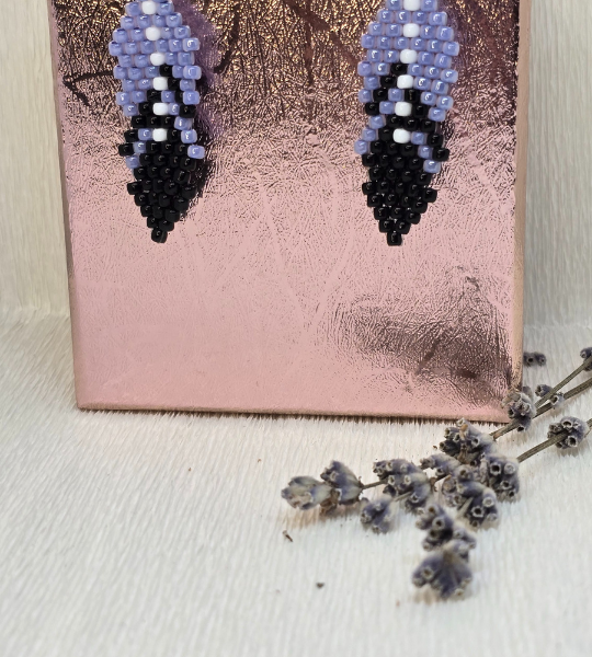 Descoperă cerceii Toho handmade „Lavender Night”, o pereche de bijuterii realizate manual, cu design modern și combinație cromatică îndrăzneață.