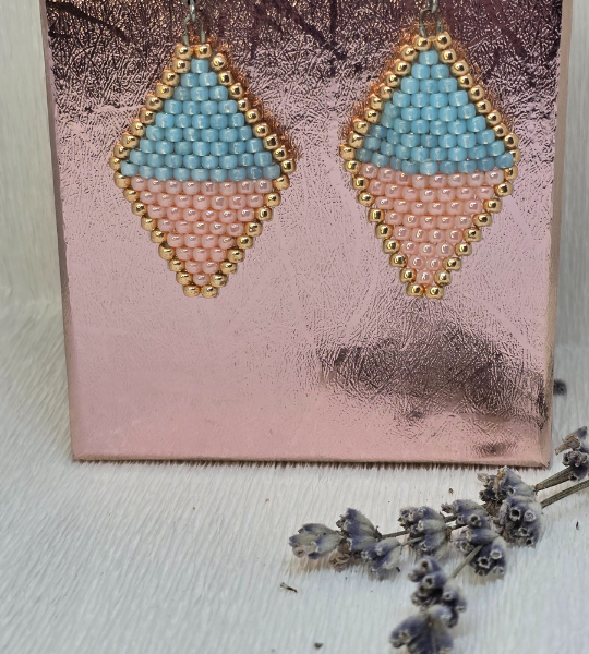 Cercei Toho handmade „Pastel Glow”, în nuanțe bleu și roz pastel, cu margine aurie. Accesorii delicate și feminine, perfecte pentru orice ținută.
