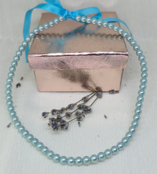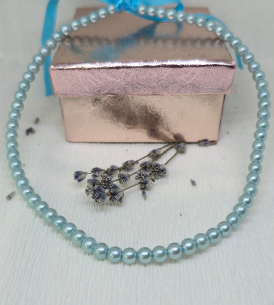 Perlele sunt alese individual, pentru a oferi un aspect uniform și elegant. Nuanța lor albastră amintește de liniștea cerului senin și de profunzimea mării. Este un accesoriu ușor de purtat, potrivit pentru orice moment al zilei.