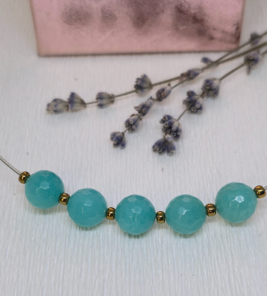 Colier handmade pe sârmă siliconată, cu cinci agate fațetate turcoaz și accente aurii. O bijuterie plină de energie pozitivă.
