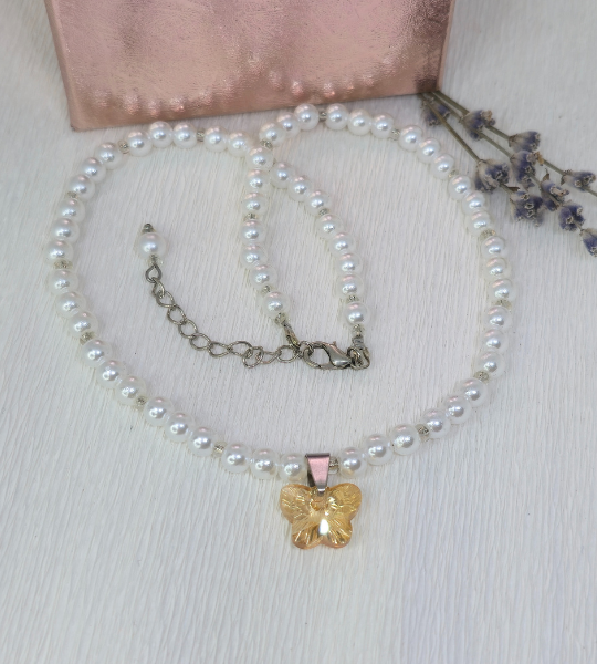 Colier handmade „Butterfly Glow” cu perle albe și pandantiv fluture galben. Elegant, simbolic și versatil, perfect pentru cadouri sau ocazii speciale.