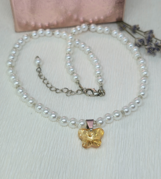 Bijuteriile cu perle sunt clasice și atemporale. Pandantivul fluture galben adaugă o notă modernă și simbolică, care îl transformă într-o piesă statement.