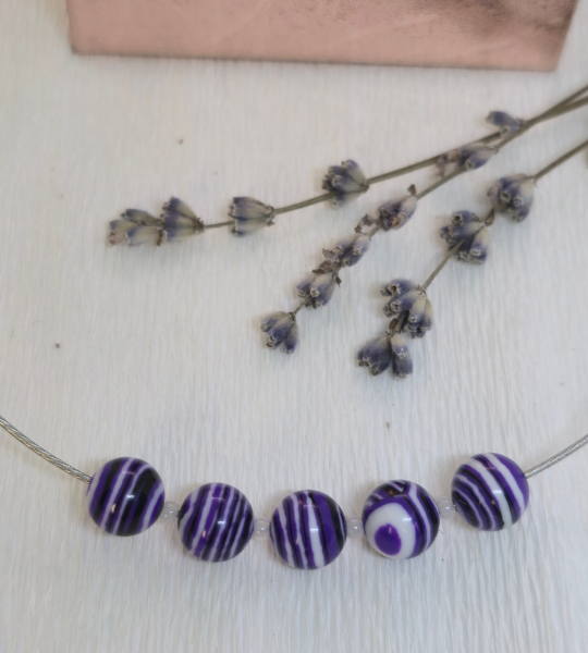 Pietrele compozite mov se remarcă prin textura lor unică și prin dungile fine, care adaugă un plus de rafinament. Ele transformă fiecare colier într-o piesă deosebită, ce se evidențiază prin eleganță și stil. Fiind o bijuterie handmade, fiecare exemplar este unic, creat cu atenție și grijă la detalii.