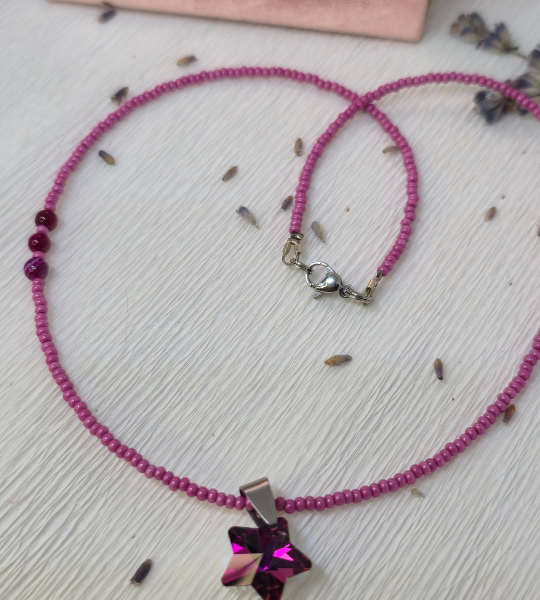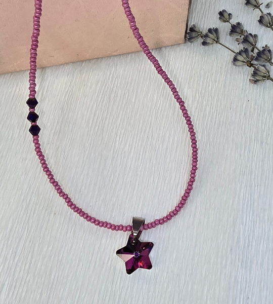 Colier Toho cu stea din Swarovski– Mov pastel – Colierele handmade Amma Design sunt bijuterii create cu migală, pasiune și atenție la detalii. Fiecare colier este realizat manual, folosind mărgele Toho de calitate superioară, combinate cu pietre semiprețioase sau cristale elegante.