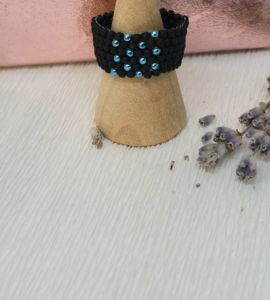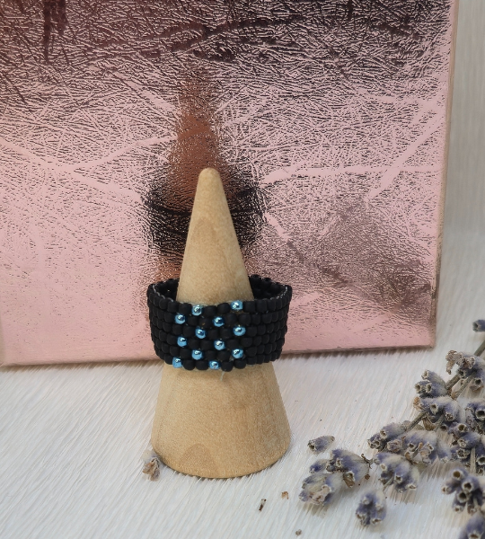 Inel handmade cusut cu mărgele Toho negre și albastre, o bijuterie unică, elegantă și ușor de purtat zilnic.
