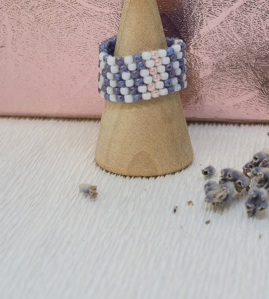 💍 Fii delicată și elegantă cu acest inel handmade pastelat, realizat cu mărgele Toho mov, alb și roz pal.