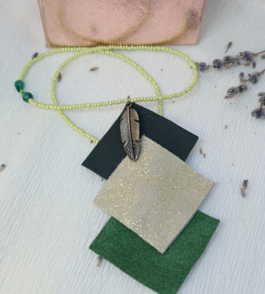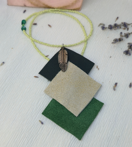 Pandantivul este format din trei plăcuțe din piele naturală, în nuanțe de verde, maro și crem cu accente punctate. Aceste culori pământii creează un efect vizual armonios și atrăgător. Charmul central, o frunză bronz elegantă, completează designul și adaugă o notă boho chic.