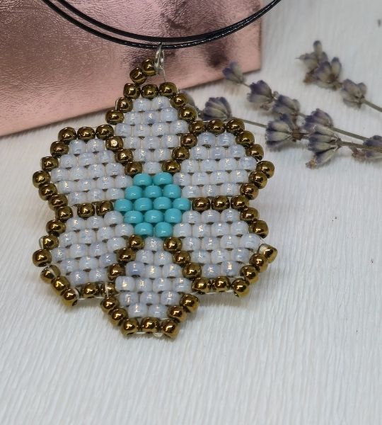 Pandantiv handmade Flore Albă, cusut manual din mărgele TOHO de 4 mm. Elegant, unicat și plin de rafinament.