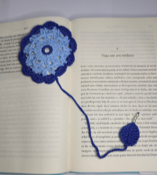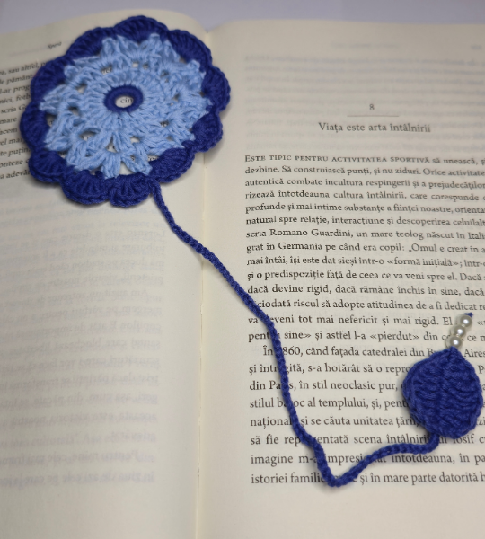Semn de carte croșetat manual în două nuanțe de albastru, elegant și practic, ideal pentru iubitorii de lectură.