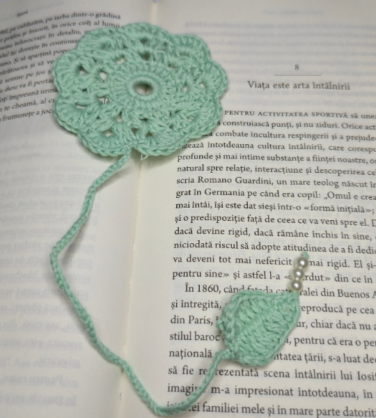 Acest semn de carte croșetat din bumbac „Green Leaf” este un accesoriu unic, creat manual pentru cititorii care iubesc detaliile elegante.