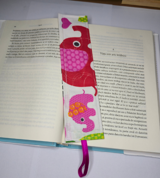 Semn de carte handmade din bumbac, cu imprimeu vesel cu elefanți și panglică satinată. Ideal pentru copii și cadouri.