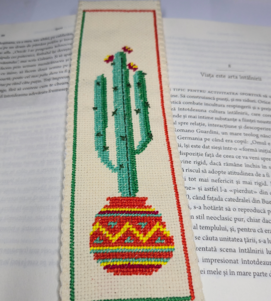 Acest semn de carte handmade „Cactus în ghiveci” este o alegere perfectă pentru iubitorii de cărți și detalii unice. Realizat manual pe pânză de goblen, acest accesoriu combină tradiția cusăturii cu un design modern și colorat. Modelul cactusului verde, așezat într-un ghiveci viu colorat, aduce un strop de veselie fiecărei lecturi.