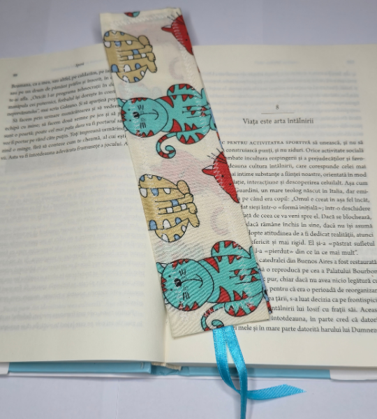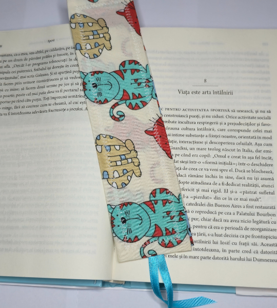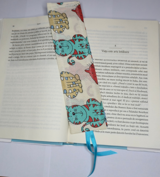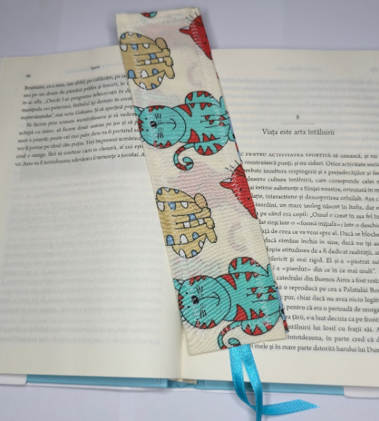 Semn de carte handmade din bumbac, cu imprimeu vesel cu pisici colorate, ideal pentru iubitorii de lectură și animale.