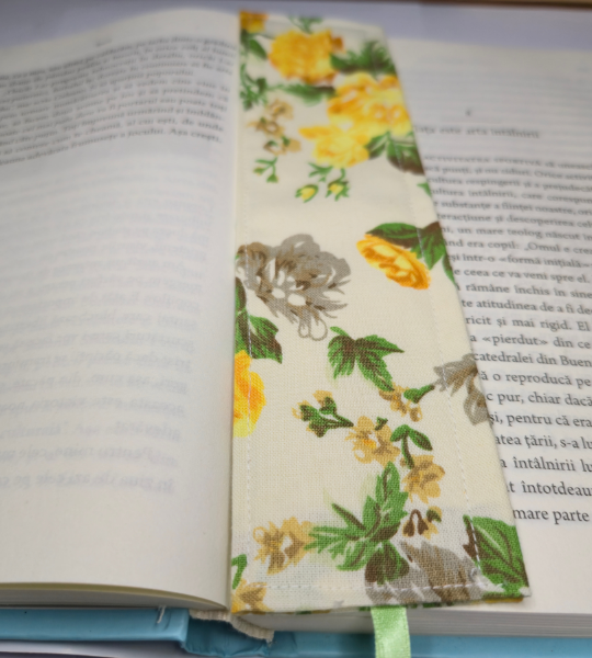 Semn de carte handmade din bumbac cu imprimeu floral galben, delicat și practic, ideal pentru iubitorii de cărți și cadouri speciale.