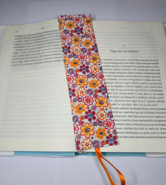 Semn de carte handmade din bumbac cu imprimeu floral vesel și panglică portocalie. Ideal pentru iubitorii de lectură și cadouri unice.